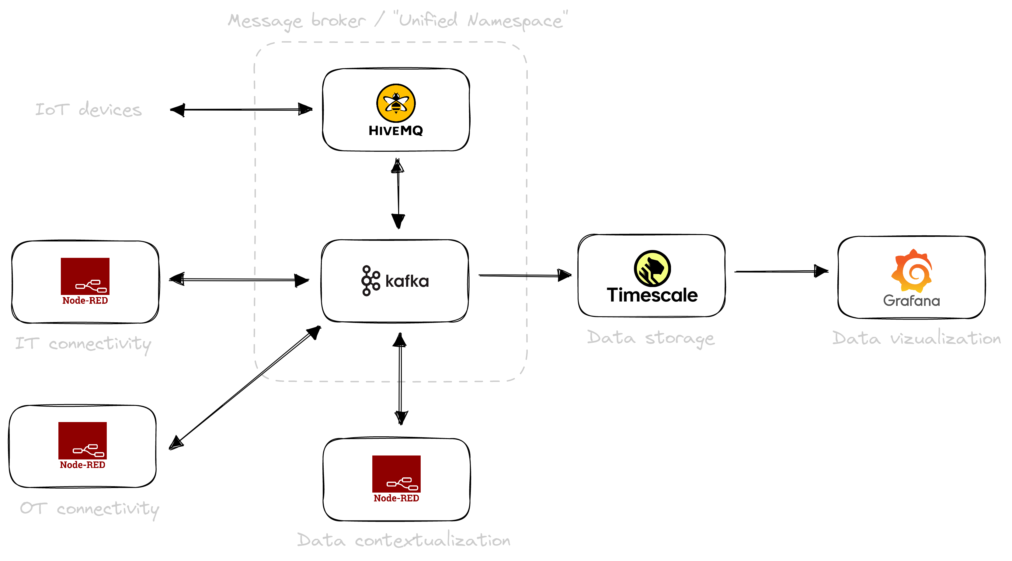 Why start from scratch when you can leverage a proven open-source blueprint? Kafka, MQTT, Node-RED, TimescaleDB and Grafana with the press of a button - tailored for manufacturing and ready-to-go