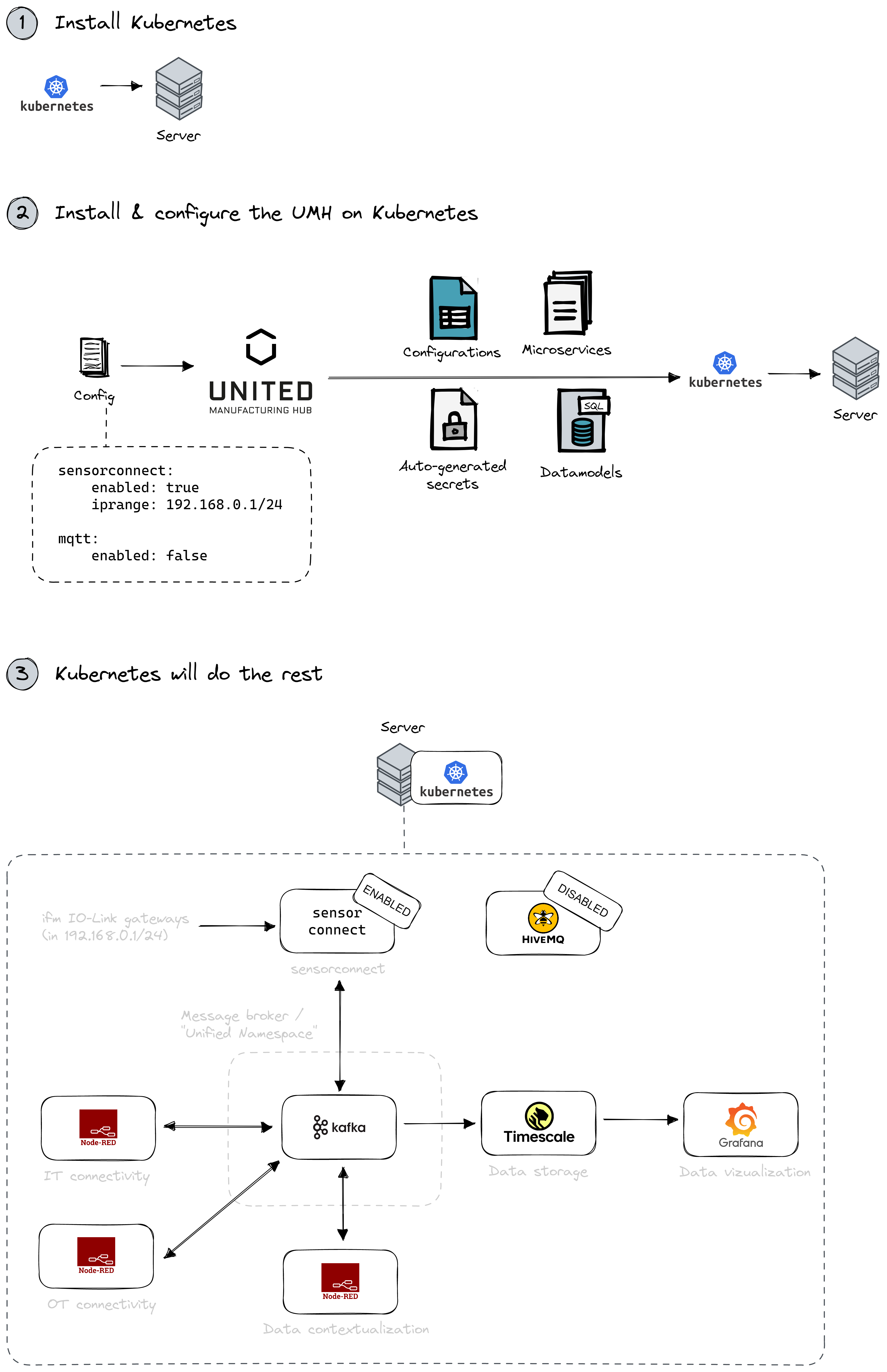 Only requirement: a Kubernetes cluster (and we'll even help you with that!). You only need to install the United Manufacturing Hub Helm Chart on that cluster and configure it.
